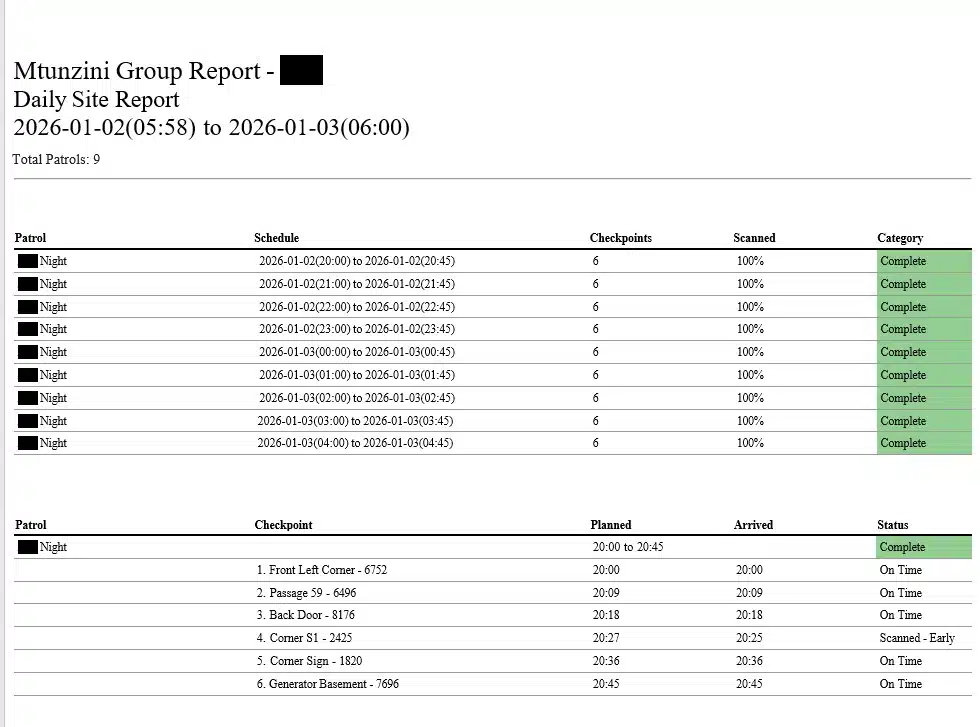 Mtunzini Group digital security patrol report showing real-time GPS tracking and time-stamped checkpoints. Example of electronic guard monitoring system replacing manual logbooks in Cape Town and Johannesburg.